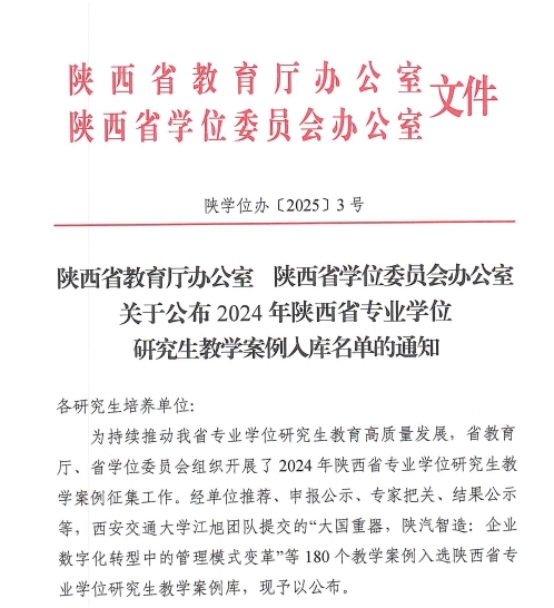 祝贺舒凯教授团队案例入选陕西省专业学位研究生教学案例库
