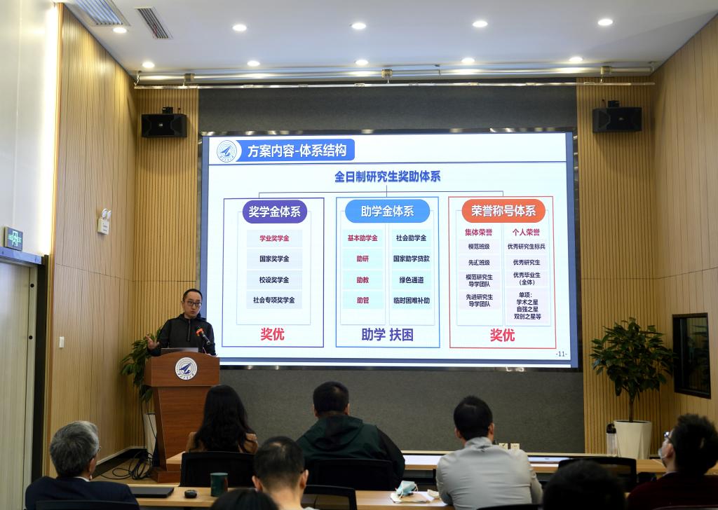 王宇恒带领参会导师学习学校研究生奖助体系改革相关政策和改革后的奖助体系,明确奖助体系和成本分担是优化招生资源配置和落实导师责任的重要手段,导师应为所指导研究生100%设立助研岗位并按时足额发放助研费,并在研究生培养环节给予足够的科研经费支持。
