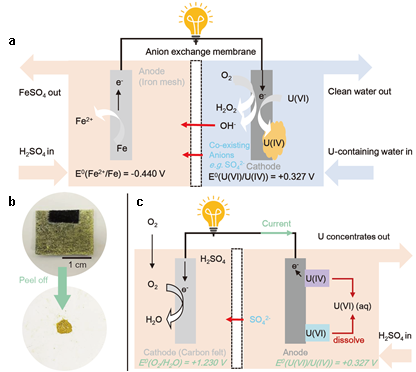 图1 (a)自驱动废水电化学提铀工艺; (b)机械剥离法和(c)电极反转制备铀产品示意图