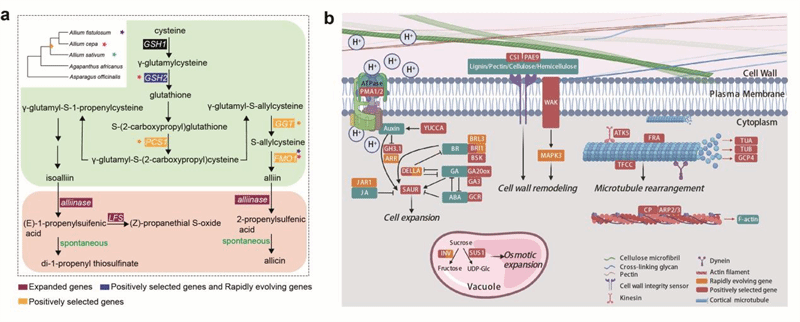 该研究围绕具有重要食用和药用价值的葱属植物,从葱蒜独特气味和膨大球茎的角度系统解析了这些重要性状形成和演化的分子机制。结合代谢组和大尺度的进化基因组学分析,构建了葱属植物特有的蒜氨酸合成代谢通路,发现该通路起源于基部植物类群中已存在的防御通路(图2a)。通过高精度时空转录组数据分析,绘制了参与球茎膨大基因通路的全景图(图2b),提出包括细胞骨架重排、植物激素调控、液泡内糖代谢与转运等多种基因通路共同作用导致球茎膨大。该成果对未来实现葱属作物的分子育种提供了重要基础,也凸显了基因组大数据在生物多样性保护研究与利用中的重要价值。