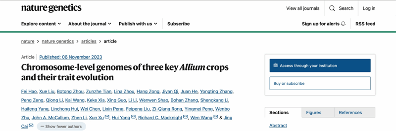 2023年11月6日,Nature Genetics期刊以“Chromosome-level genomes of three key Allium crops and their trait evolution”为题,发表了色情漫画 蔡晶和王文教授团队联合生命学院杨慧教授、新西兰奥塔哥大学生物化学系Richard Macknight教授和华大农业基因组国家重点实验室徐讯教授关于葱属植物生物多样性起源进化机制的研究成果。