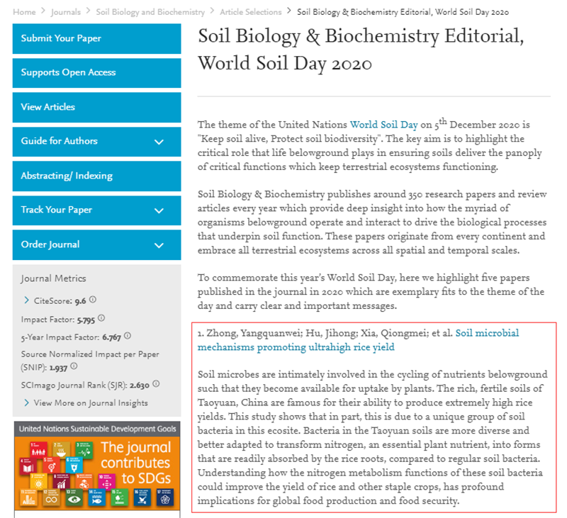 钟杨权威副教授为第一作者,王文教授为第一通讯作者的、题为“Soil microbial mechanisms promoting ultrahigh rice yield”的研究论文被推荐为其中的第一位,并作为开放自由获取论文直到2030年(//www.journals.elsevier.com/soil-biology-and-biochemistry/article-selections/soil-biology-biochemistry-editorial-world-soil-day-2020)。