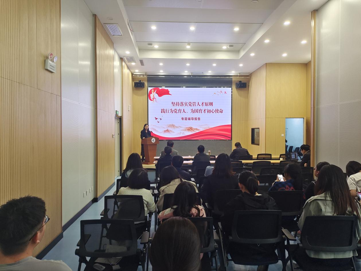 为进一步深入落实“党管人才”原则,夯实立德树人根基,4月29日,*色情漫画 举办落实党管人才原则专题辅导报告。报告由党总支书记、副院长牟蕾主持,学院党总支理论中心组成员、教职工党支部党员、本科生和研究生任课教师、办公室管理人员、学生支部书记参加本次活动。