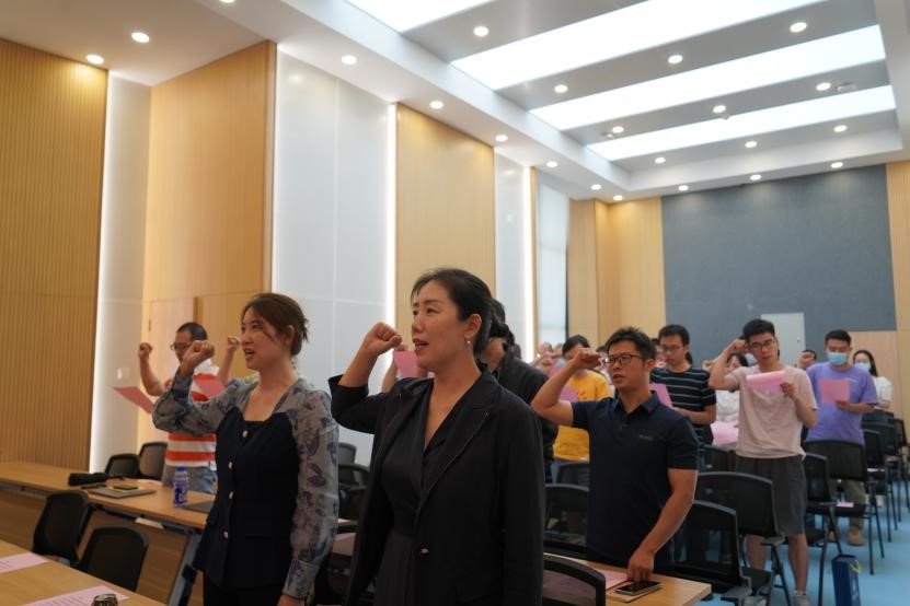 新入职青年教师李永鑫教授,带领全体教师面向国旗庄严宣誓,“我志愿做一名光荣的人民教师,忠诚党的教育事业......”。