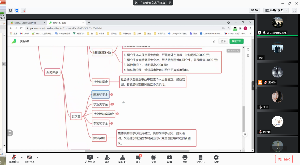 奖助对象以及奖助学金体系的相关内容,同时强调了诚信做人、诚信做事的重要性。一等学业奖学金获得者许文杰分享了其获得奖学金后的心得感受,他认为,研究生要学会平衡科研与生活,保证科研工作量,开拓科研思维,对实验数据负责的同时也要积极参加学校学院组织的文体活动,追求德智体美劳各方面和谐的发展。