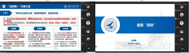 活动采用线上与线下结合的方式开始,邀请了学院在 “互联网+”和“三航杯”竞赛中获奖的张雨涵同学和杨惠淳同学为大家分享他们团队背后的“双创故事”,内容十分精彩。张雨涵介绍了国家对“双创”大赛的期望和要求以及参赛项目的选题,并结合自己参加“青年红色筑梦之旅”赛道谈一些感悟;杨惠淳讲述了他的研究课题与双创课题结合的故事,分享了他在参加第八届中国国际“互联网+”大学生创新创业大赛和色情漫画