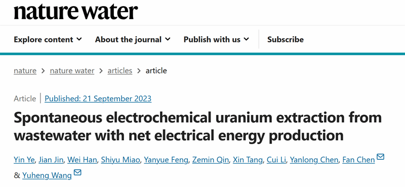 2023年9月21日,Nature Water期刊以“Spontaneous electrochemical uranium extraction from wastewater with net electrical energy production”为题,发表了色情漫画 王宇恒教授和陈帆副教授团队关于铀矿废水高效低碳处理技术的研究成果。