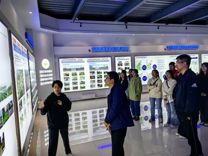 师生首先参观了海绵城市技术中心展厅,学习了海绵城市建设的核心理念、技术体系及实际应用案例通过讲解员生动详细的讲解和实地观摩,大家深刻认识到海绵城市在应对城市水问题、改善城市生态环境方面的巨大潜力。师生们还参观了透水铺装、雨水花园、生态滞留池等多个海绵城市建设示范项目。